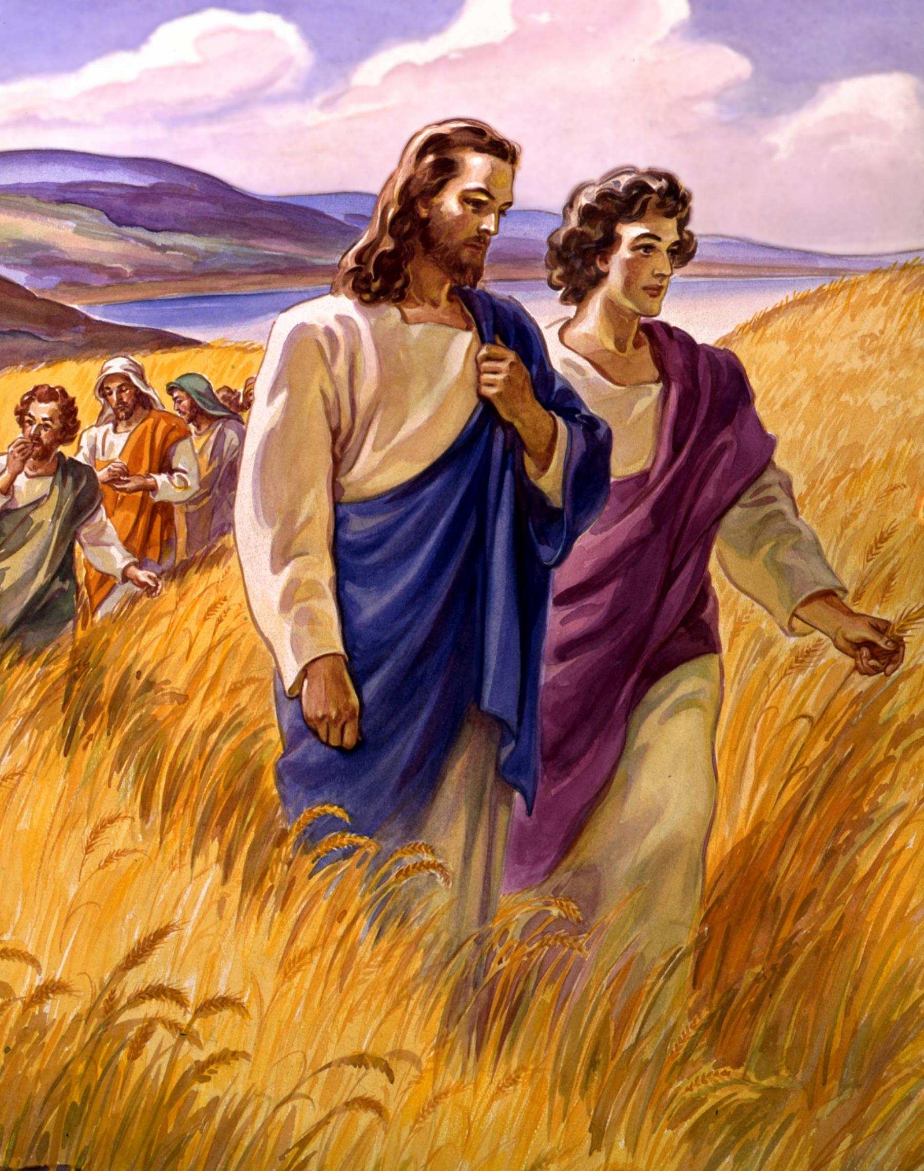 Jesus Jesus' disciples gather some grain in a grainfield for food, but were chastized by the religious leaders for doing this on the Sabbath (Matthew 12:1-8; Mark 2:23-28; Luke 6:1-5). jesus; disciple; grain; food; sabbath; matthew 12:1-8; mark 2:23-28; luke 6:1-5; harvest; rule; rule; ruled; ruling; ruler; ruler's; rulers'; disciples; grains; foods; sabbaths; harvests; rules; rulers |
