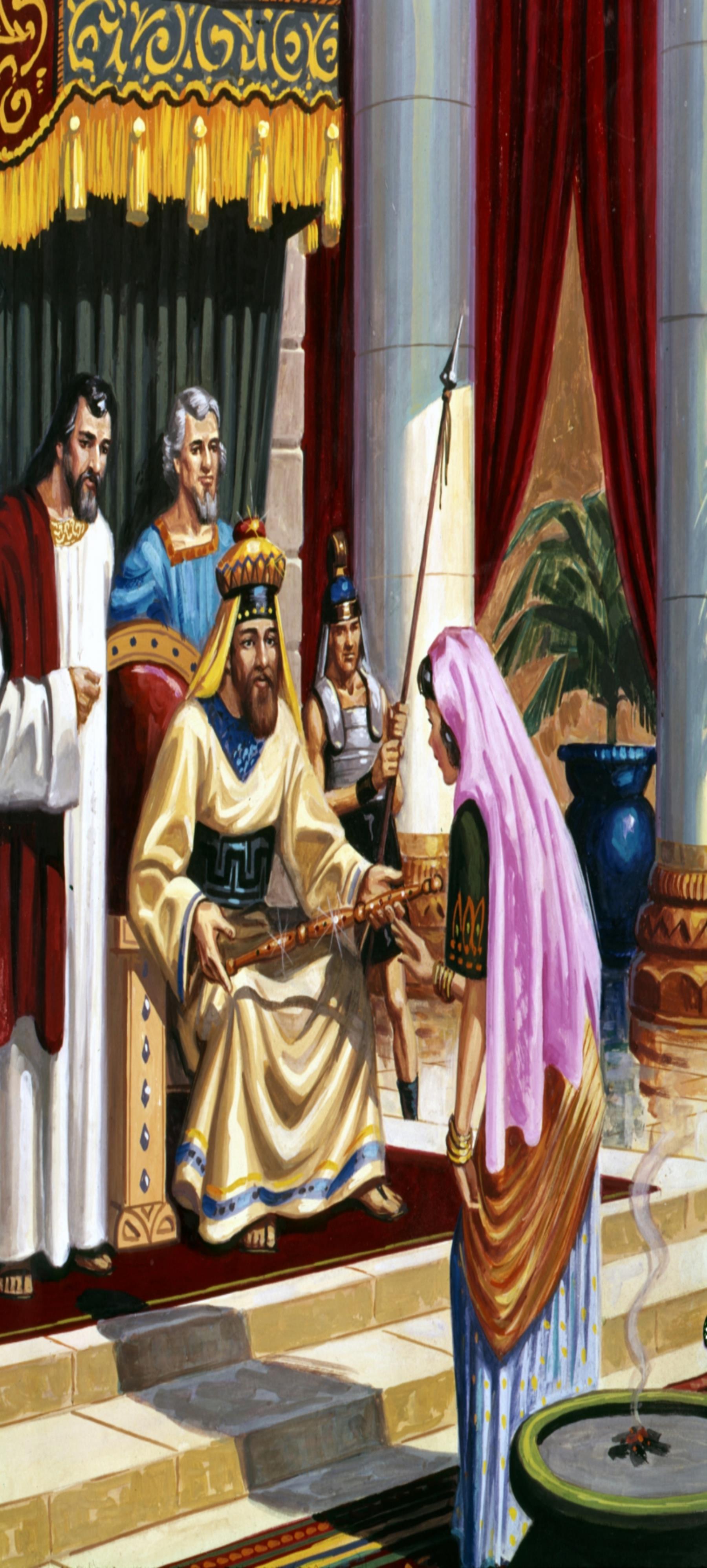 Esther When the wicked Haman tricked the king to order the death of all Jews, Queen Esther risked her life to appear before the king without his permission. But he held out his golden scepter to show that she was welcome (Esther 5:1-7). esther; queen esther; haman; king; royal; esther 5:1-7; risked life; tricked; golden scepter; welcome; kings; welcomes |