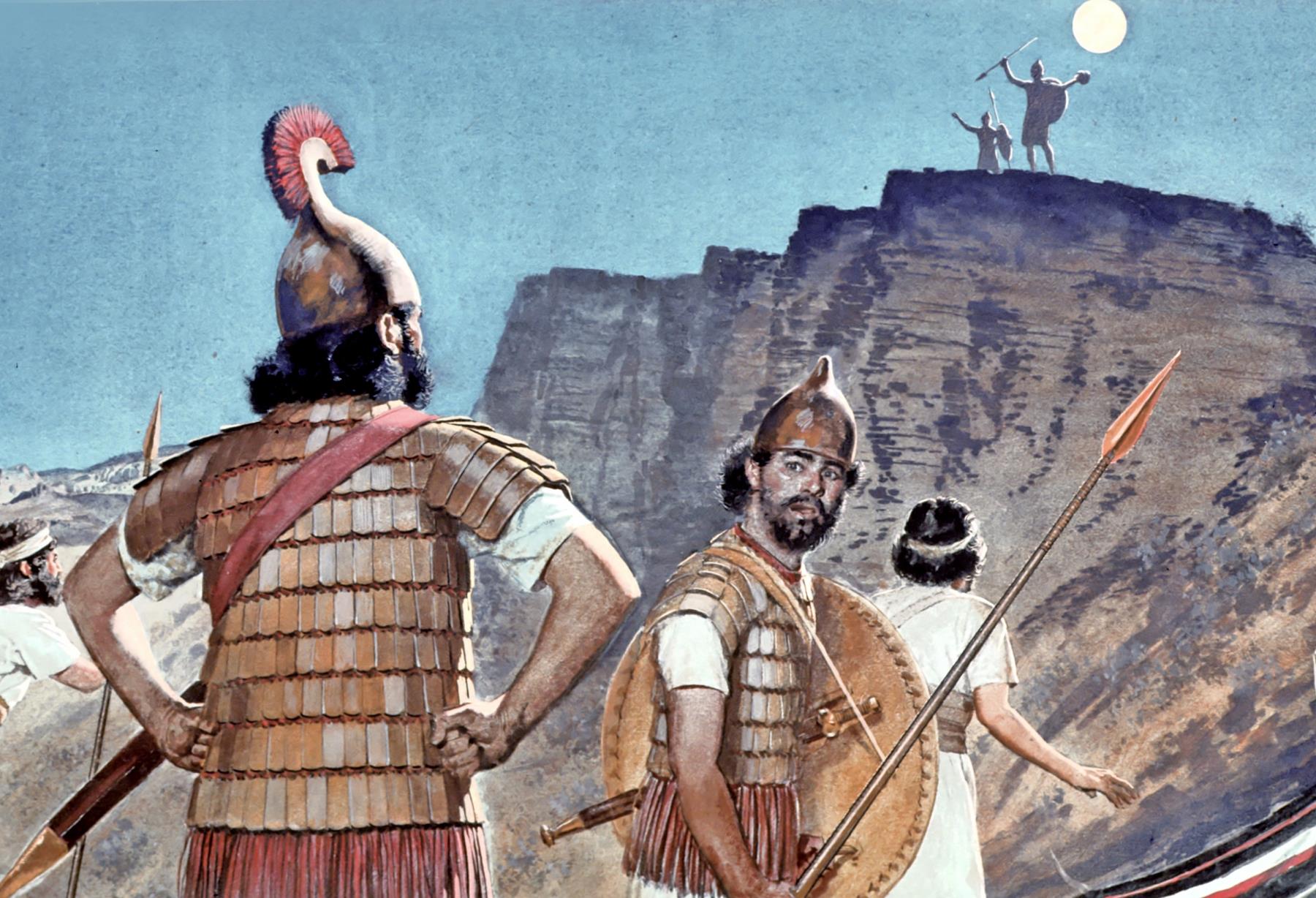 King Saul was chasing David, hoping to kill him. One night, David sneaked into Saul's camp and took Saul's water jug and spear. The next morning he showed these to Saul from a distance, telling Saul that he had shown mercy not to kill him (1 Samuel 26).