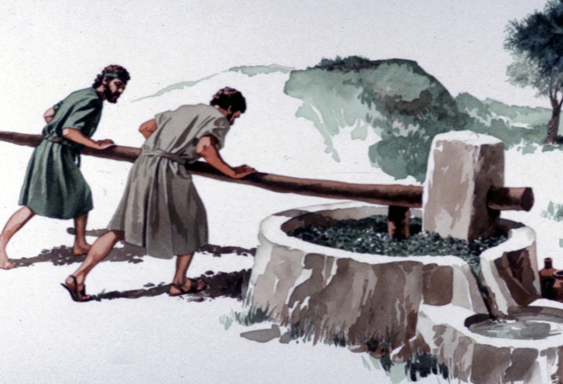 Olive The olive press seen here used a large wooden block to crush the olives and release the olive oil into a vat below. It was powered by humans or animals turning the stone, attached to a long pole. olive; olive oil; olive press; stone; wooden block; vat; olives; olive oils; stones; vats |