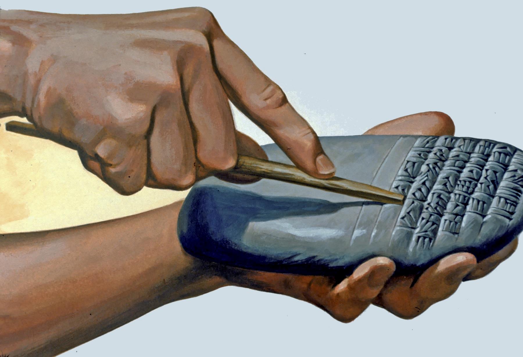 Writing People of Bible times wrote on many different materials. Clay tablets were common, and each was considered a book. Writing on clay was done with a stick, pressing wedge-shaped characters in the soft clay. This was called cuneiform. writing; write; written; clay tablets; cuneiform; wedge-shaped; book; writings; books |