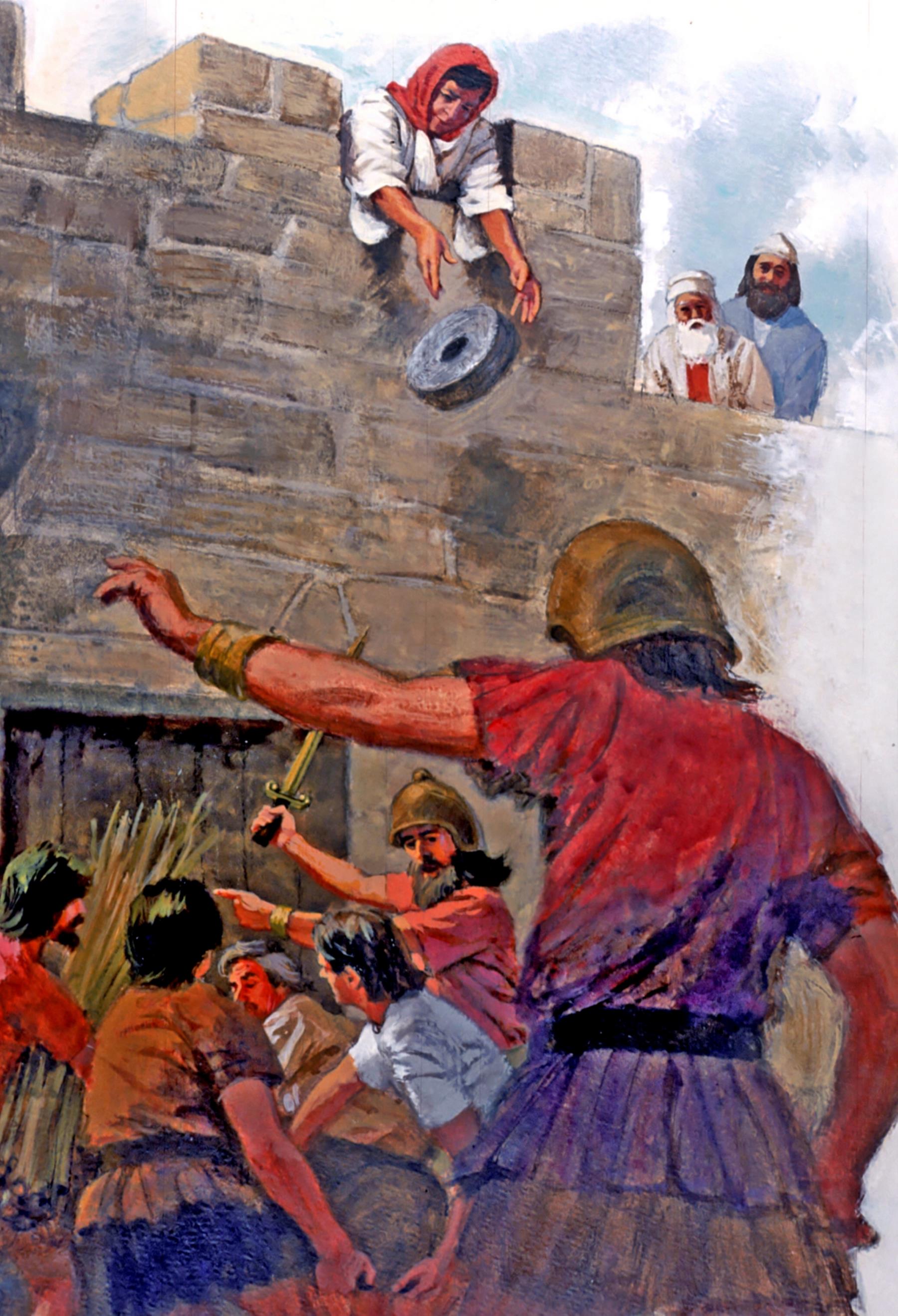 Abimelech At first the people of Shechem gave Abimelech wealth and power, but then came to regret it. Here a woman of Shechem drops a millstone on Abimelech to kill him (Judges 9:27-57). abimelech; shechem; judges 9:27-57; king of shechem; revolt; revolted; rebell; rebelled; millstone; revolts; millstones |