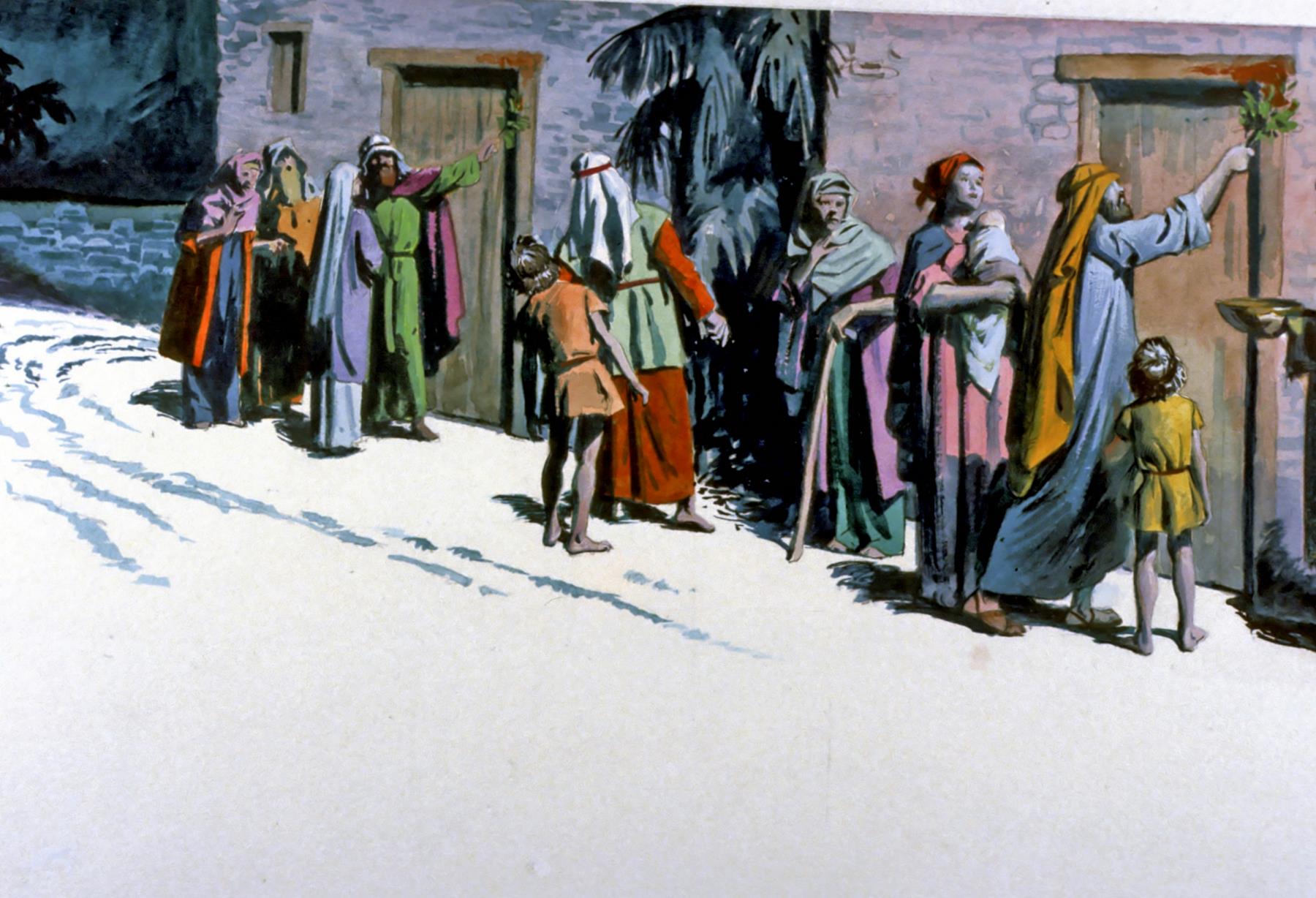 The Hebrews, or Israelites, obeyed the Lord and Moses, and put blood on the sides and top of their door frame. When the angel of death saw that, it passed over that house. Thus came the name Passover (Exodus 11--12).